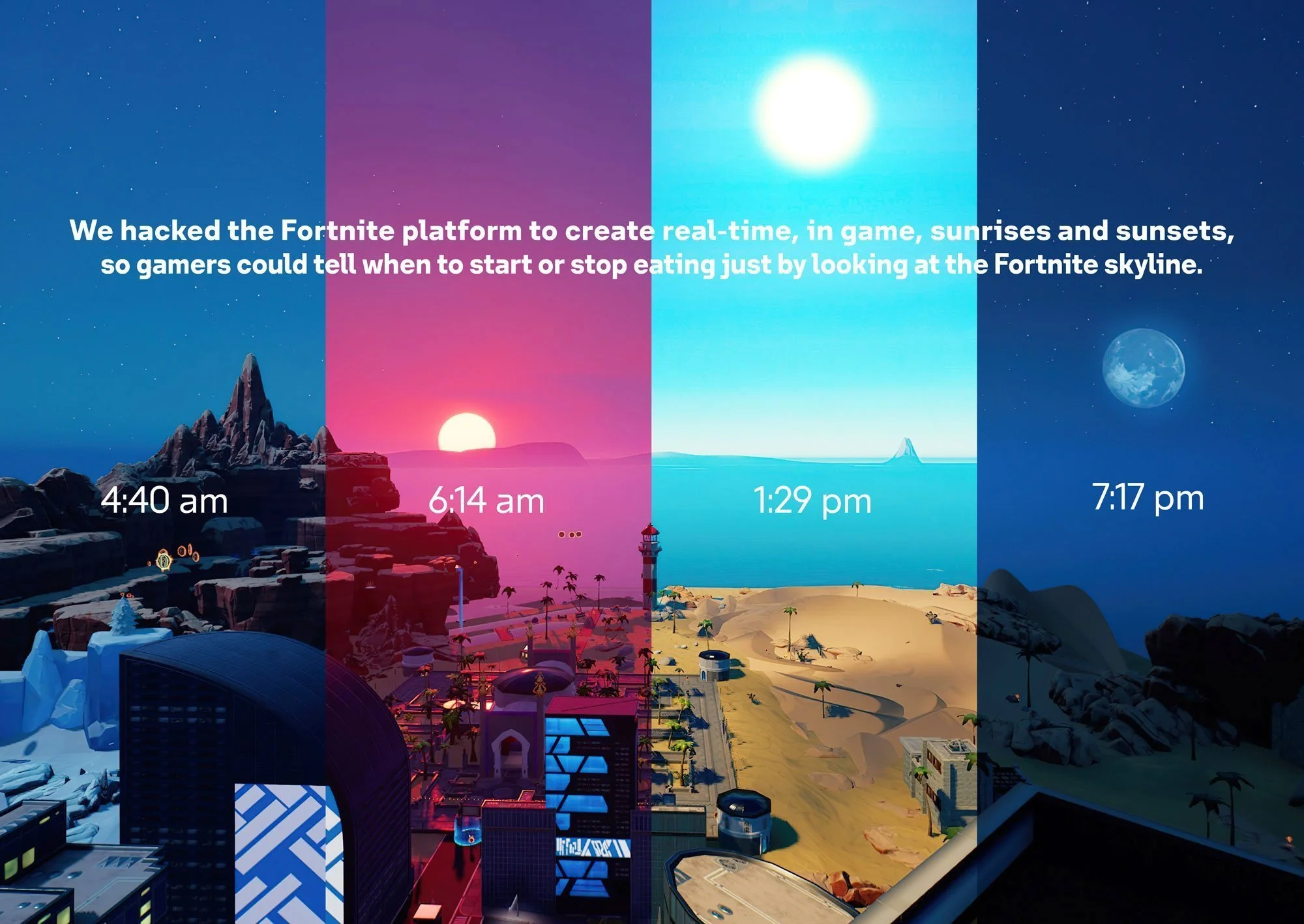 So, we created the first Fortnite mode synced with real-time. Players could tell when it was time to stop playing and start eating.